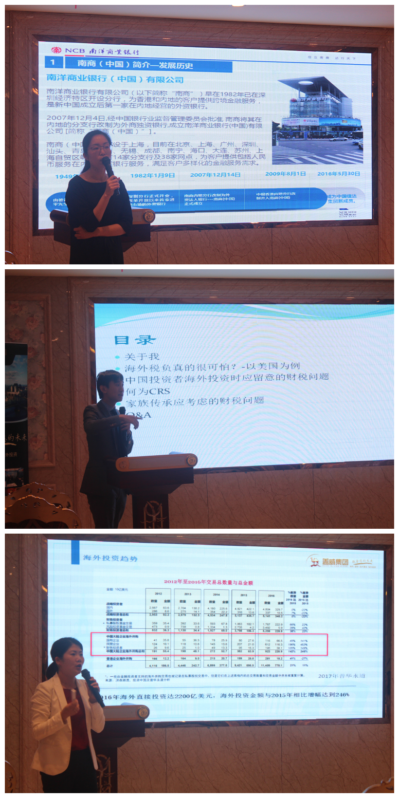 下午,首先由南洋银行金融部总经理顾晓艳女士主讲《跨境金融与中小企业贷款服务》,南洋商业银行早在1982年已在深圳经济特区开设分行,为香港和内地的客户提供跨境金融服务,是新中国成立后第一家在内地经营的外资银行。随后,盖威集团会计师刘卓尔先生为大家分享《国内外税务规划》和《中国超高净值家族应对CRS浪潮之传承规划》,他从中国投资者海外投资时应留意的财税问题、什么是CRS、家族传承应考虑的财税问题等一一进行了解读。最后,盖威集团总经理藏慧敏女士作了《全球资产配置、跨境资金现状与趋势分析》的主旨演讲,从海外投资需求、国债投资优势、移民趋势、移民要求等进行了详细解读。