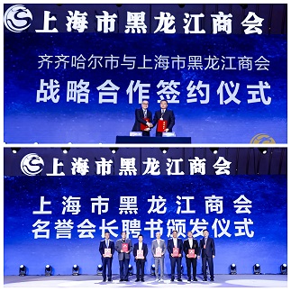 会上,黑龙江省商务厅为上海市黑龙江商会进行了黑龙江省招商引资联络处授牌,同时举行了商会党组织授旗仪式、齐齐哈尔市与商会战略合作签约并做市情推介。