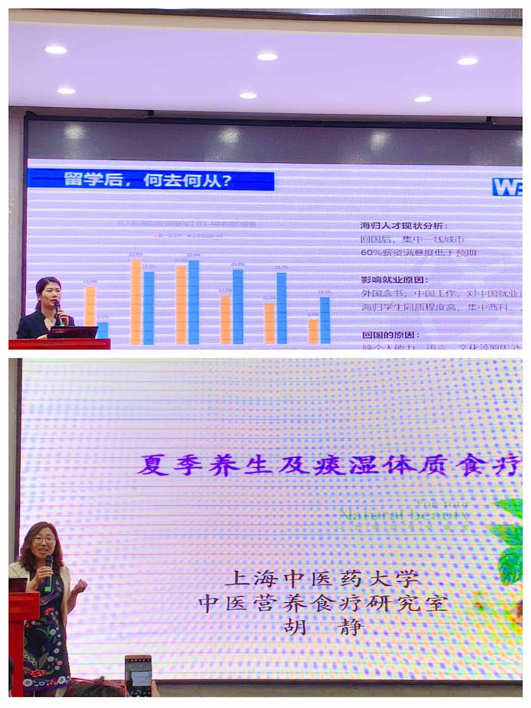 首先由商会合作伙伴威凯出国藏慧敏总经理结合目前上海教育的现状,分享了“教育之路,何去何从”以及孩子教育未来规划。随后由特邀上海中医药大学教授、龙华医院专家胡静讲解了夏季养生及痰湿体质食疗,为大家分析了痰湿体质的形成原因、日常养护注意事项、食疗方法及食疗原则,还介绍了健脾益气、利水渗湿的养生食药。