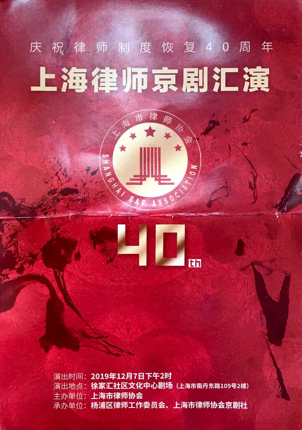 为庆祝律师制度恢复40周年,2019年12月7日,由上海律师协会主办的上海律师京剧汇演在徐家汇社区文化中心剧场顺利举办。在本次演出中,我会理事钟颖与其他两位京剧爱好者一起压轴彩唱了《二进宫》京剧名段,获得了一致好评。我会创会秘书长田磊,副会长吕东远,理事兼副秘书长郝刚,理事刘旭波、张国华,会员董学文、韩英文、李颜军、刘万发、刘志鹏到场祝贺。