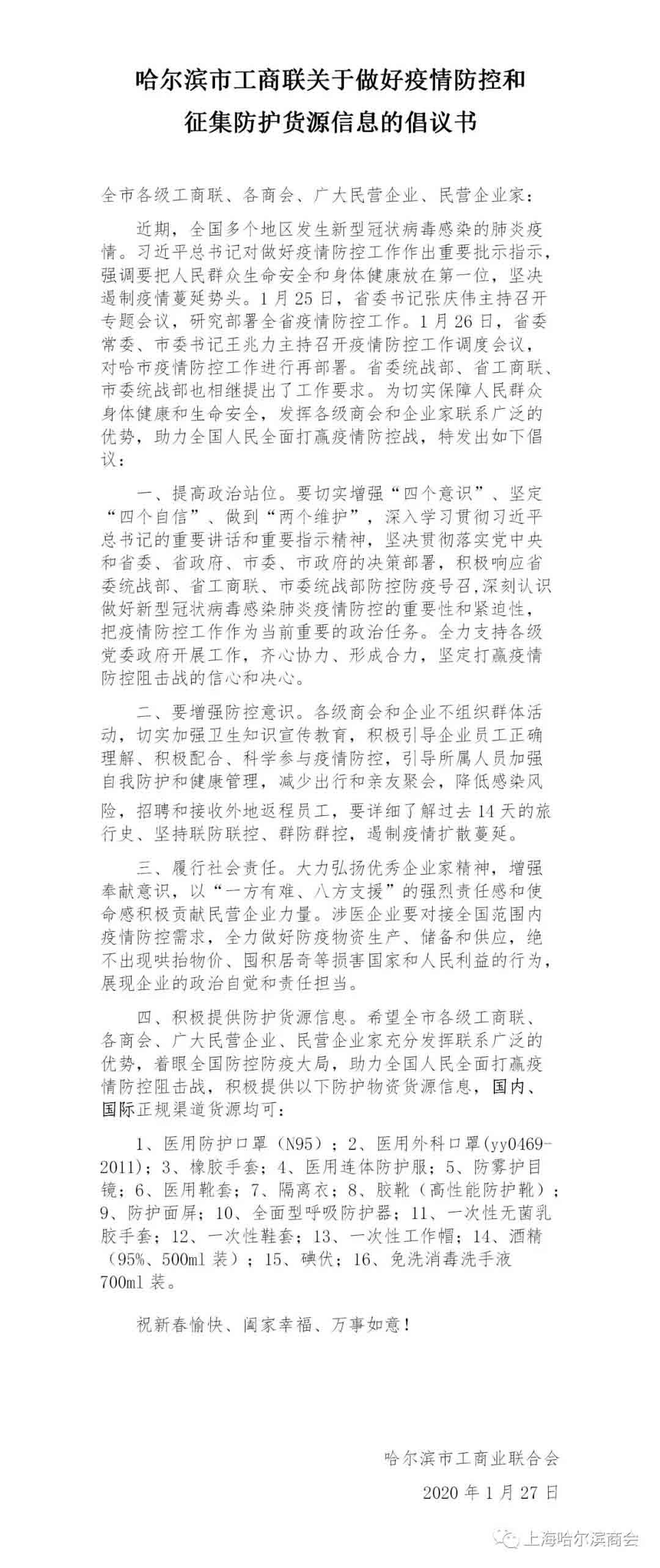 为认真贯彻落实党中央、国务院和上海市、黑龙江省以及哈尔滨市有关疫情防控决策部署,我们对上海哈尔滨商会全体会员、在沪龙江家人发出倡议,同时转发哈尔滨市工商联关于做好疫情防控和征集防护货源信息的倡议书,望大家做好自我防护之时,为战胜疫情做出积极贡献!